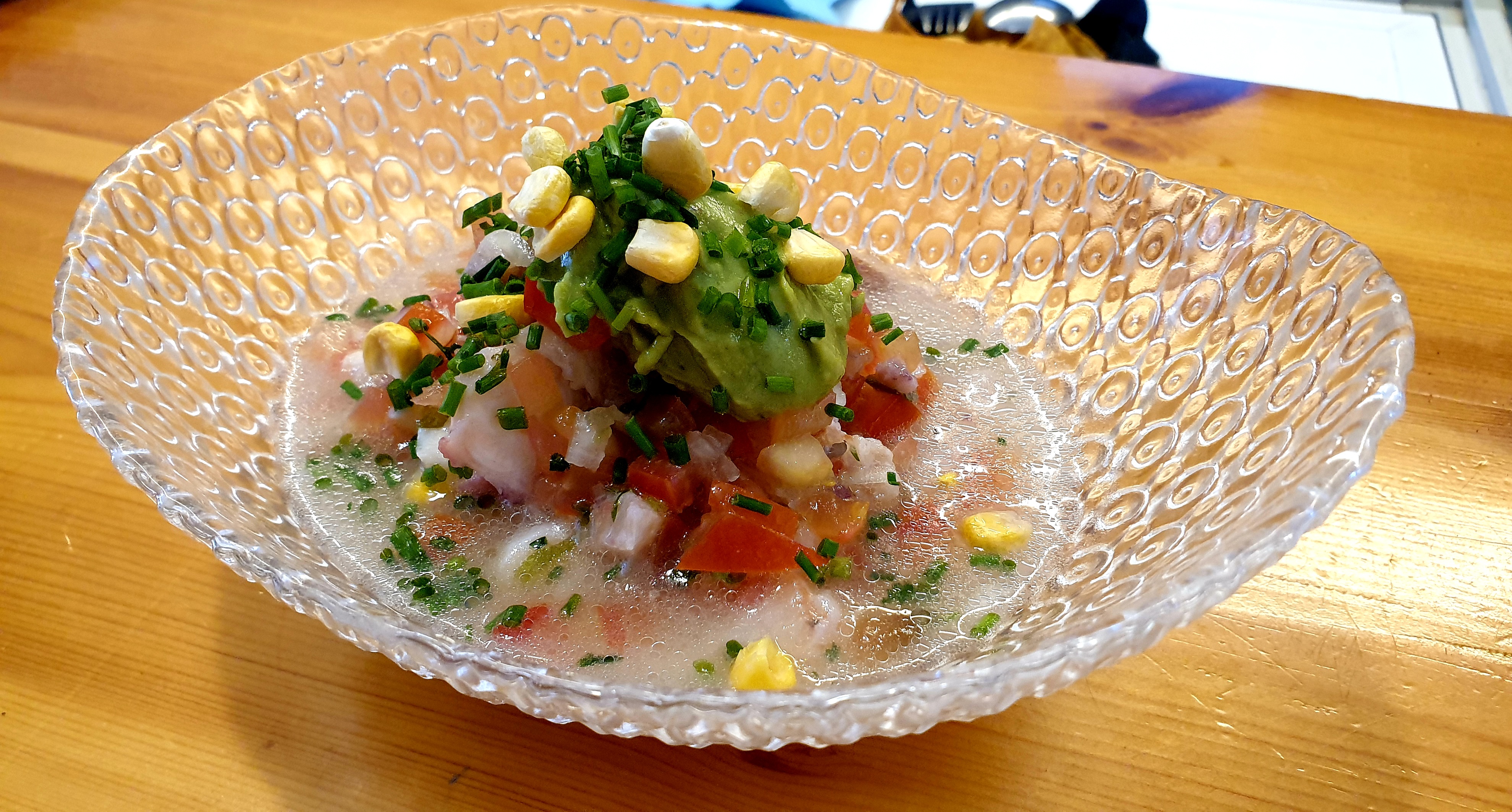 Ceviche mixto de pulpo, corvina y gamba, guacamole, aceite de jengibre, lima, cilantro y tostas de maíz
