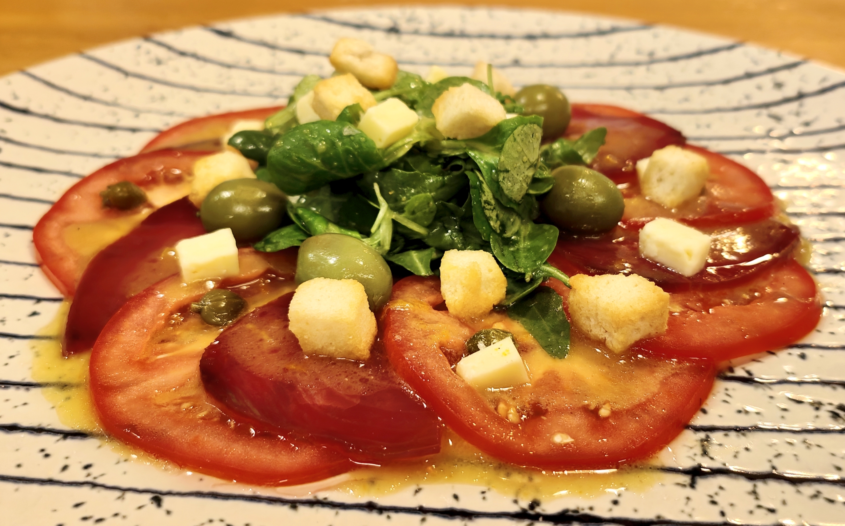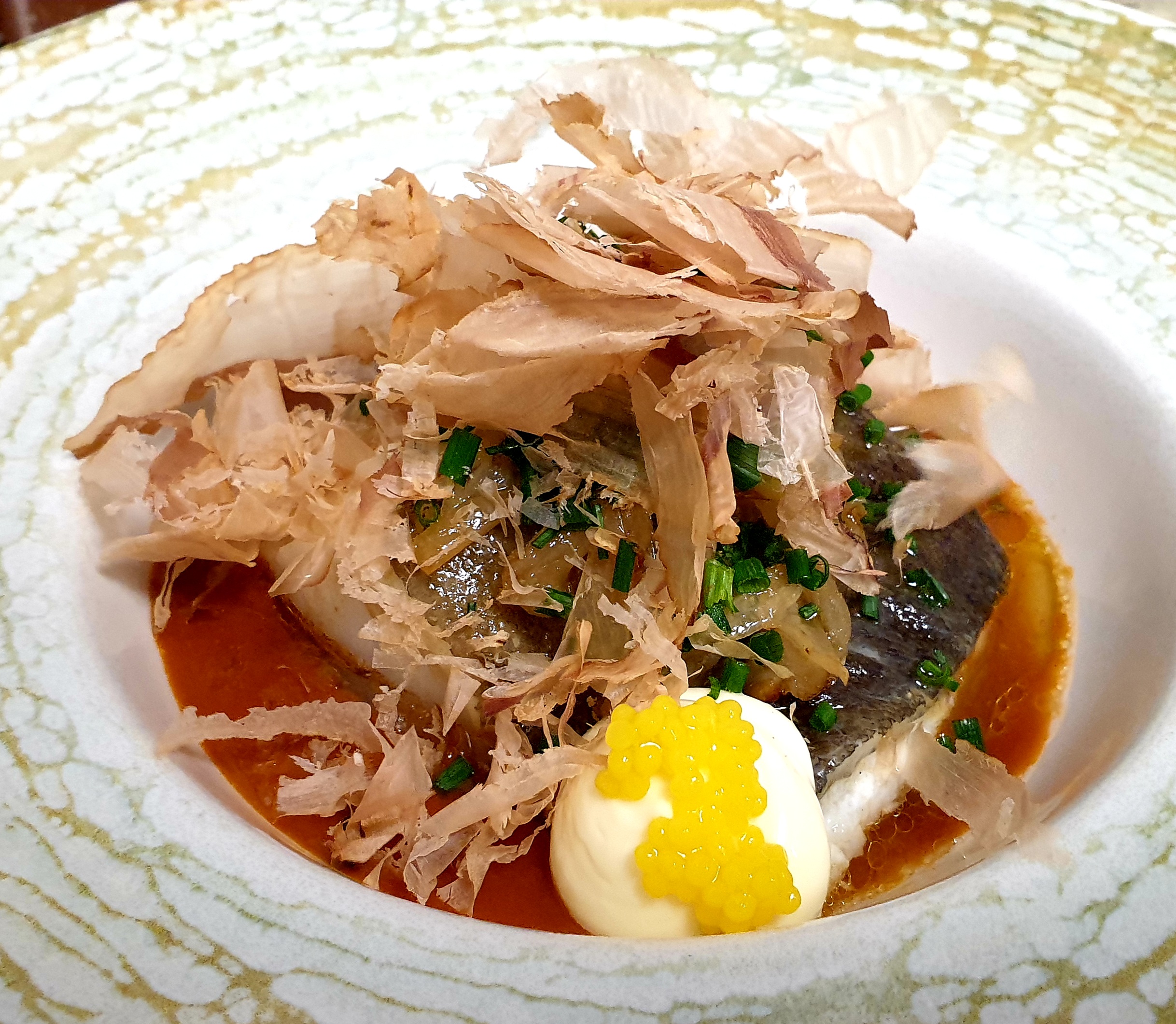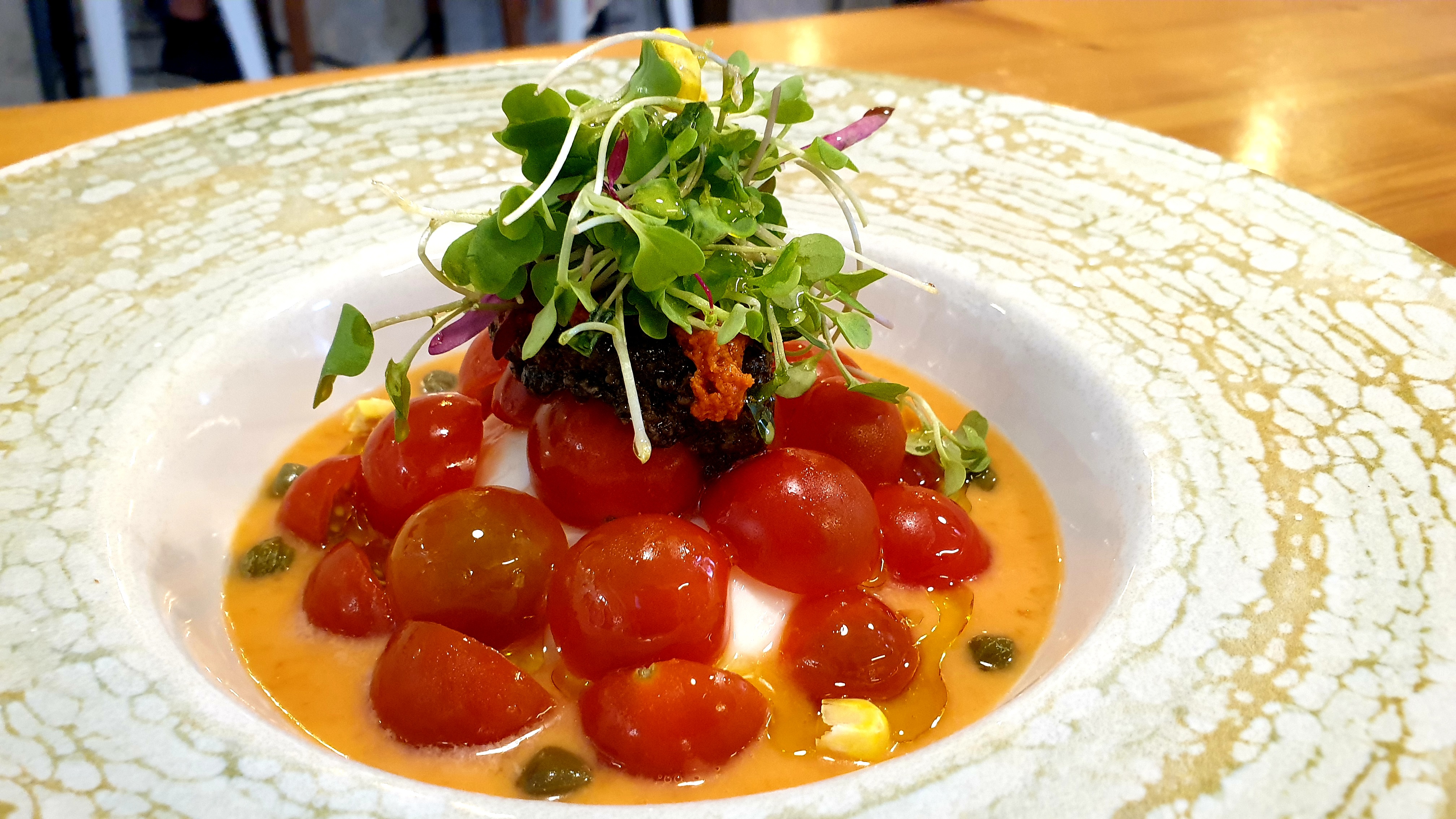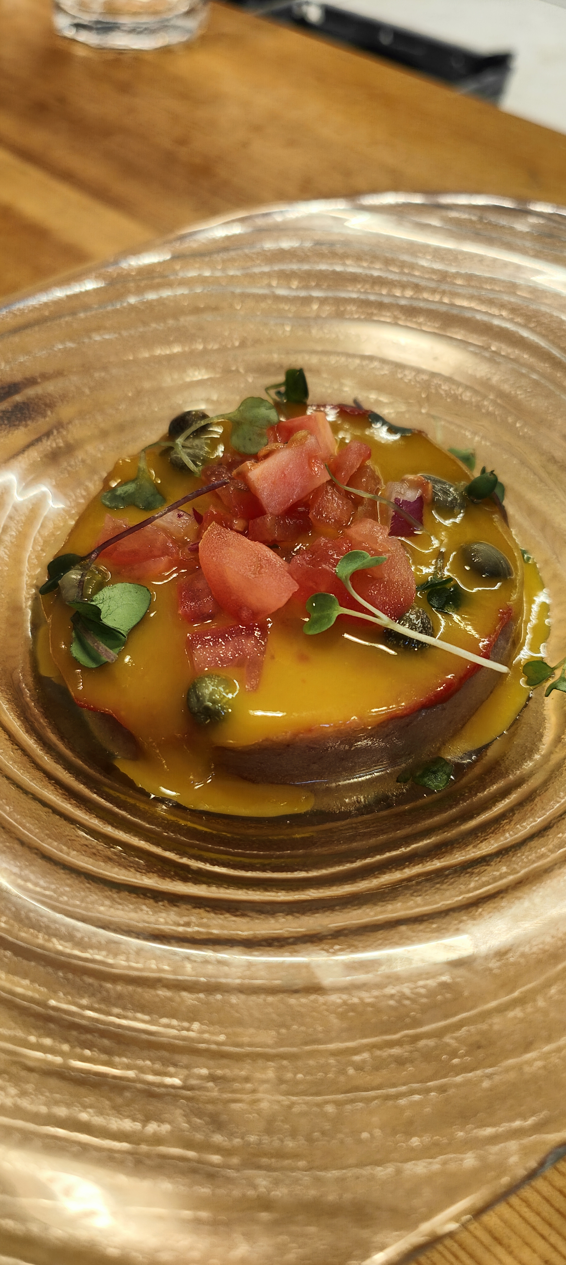 GARUM, paté de pescado azul, puré de tomate seco, coulis de fruta de la pasión, tapenade con aceitunas verdes, alcaparras, concasse de tomate y esferificaciones de fruta de la pasión
