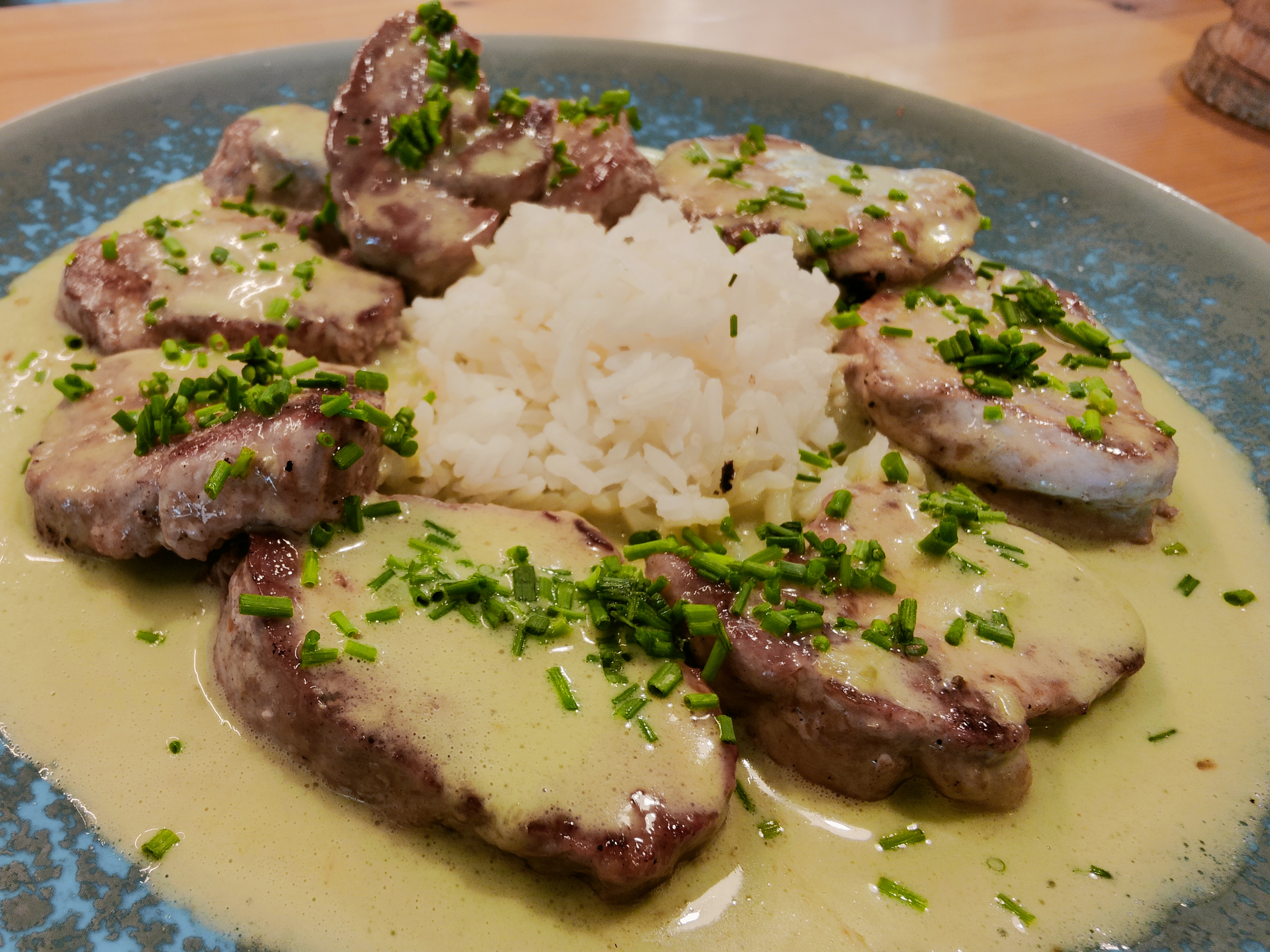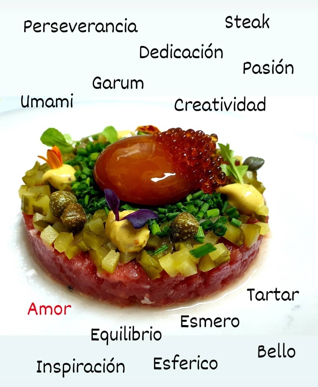 Solomillo de ternera cortado a cuchillo, pepinillo agridulce, mostaza, alcaparras, yema de huevo osmotizada en soja.