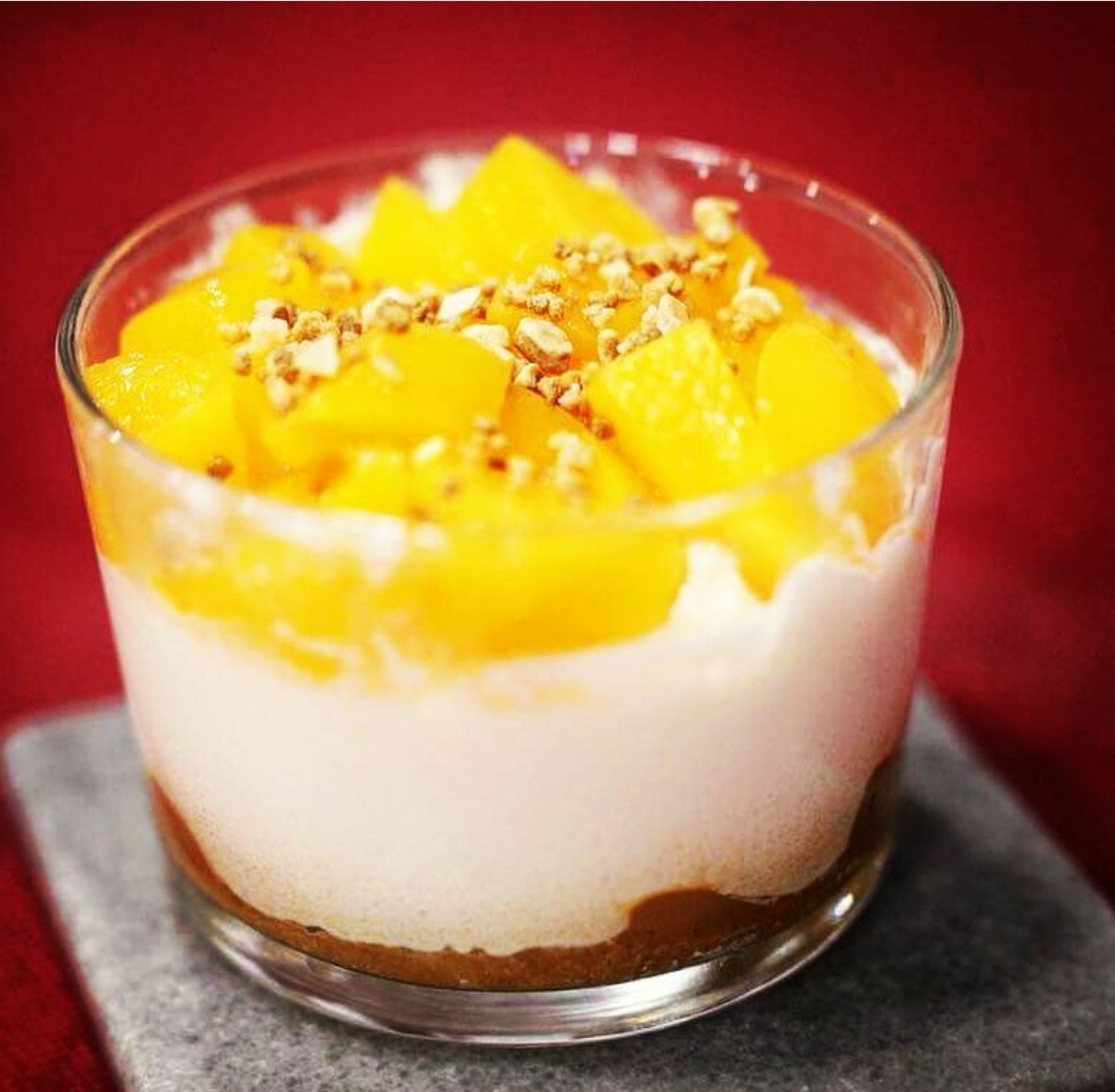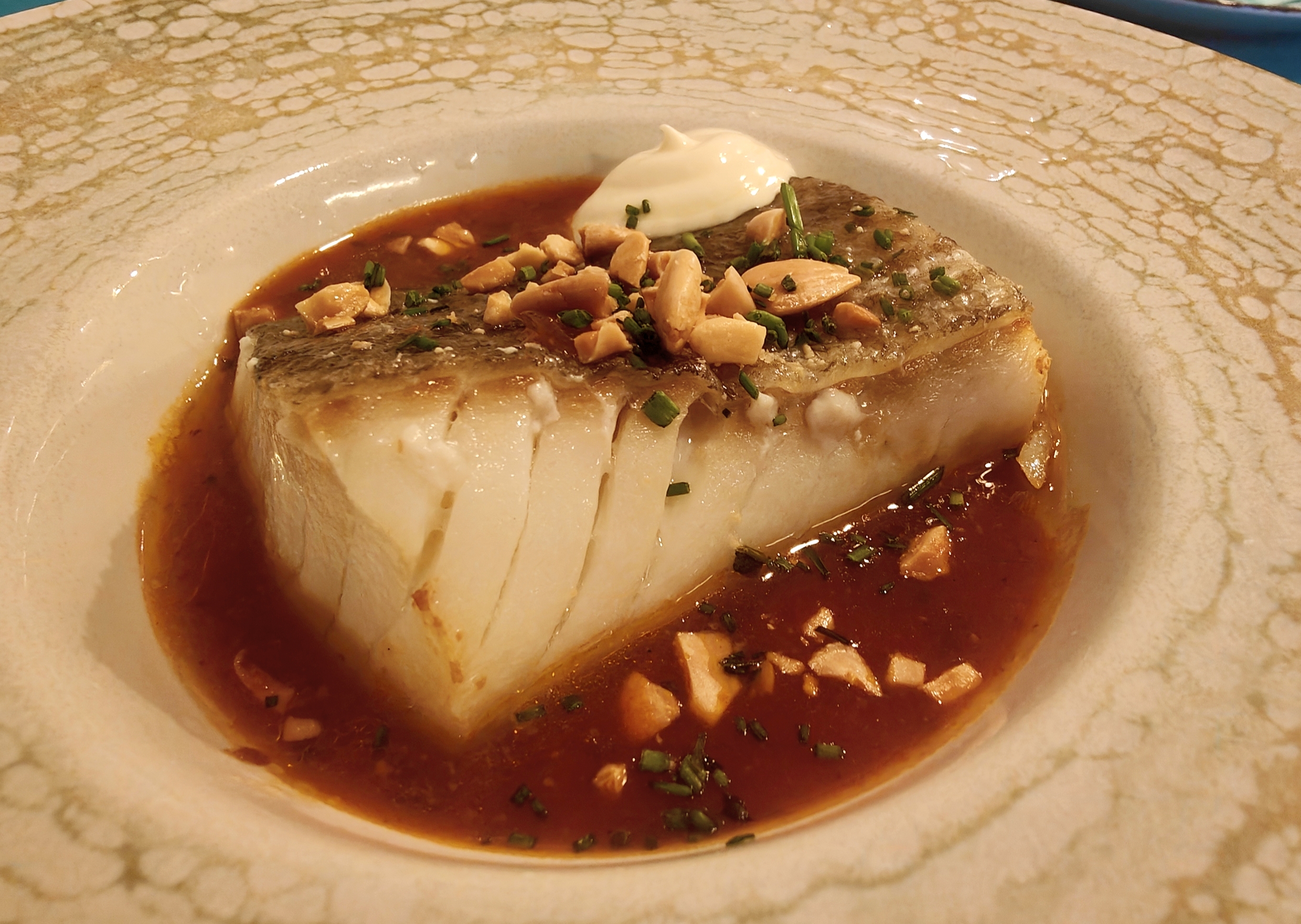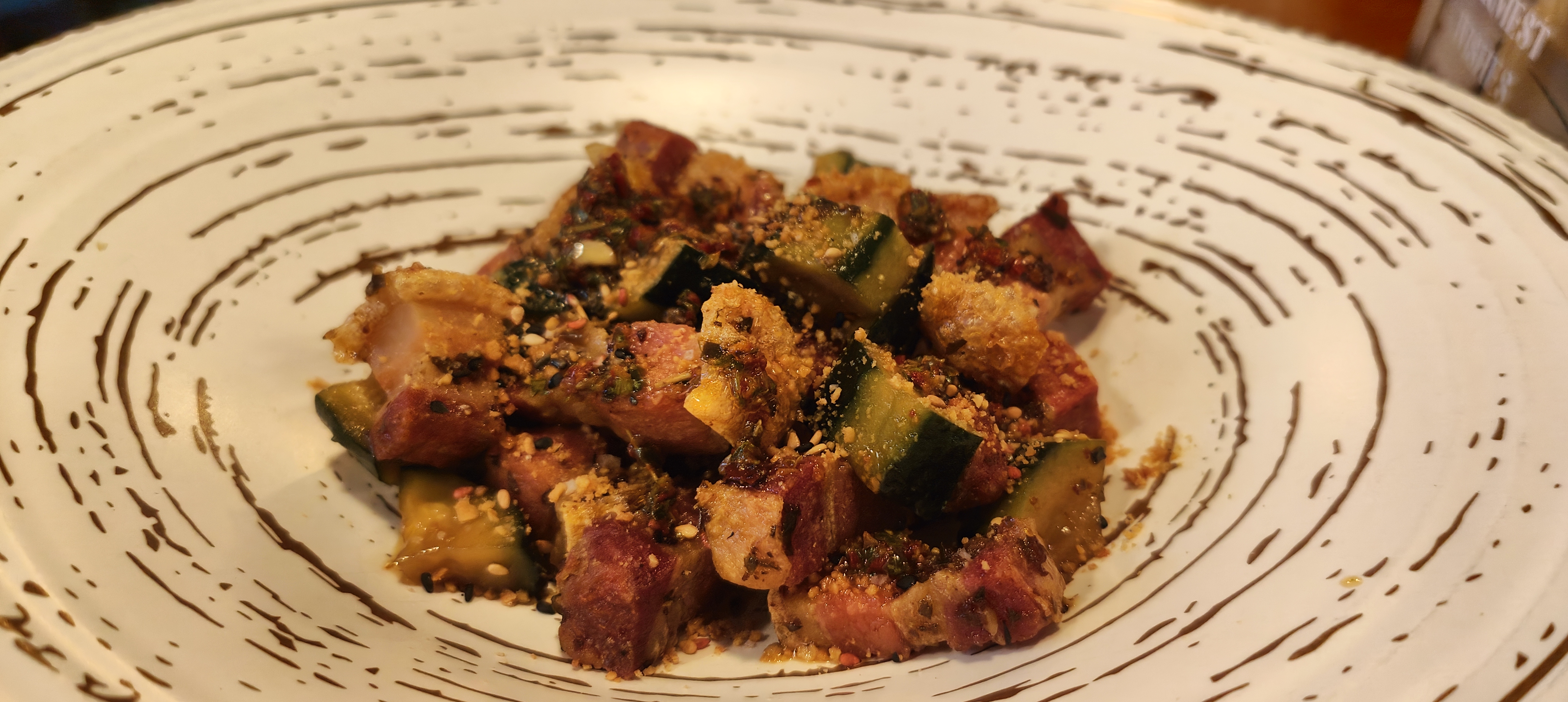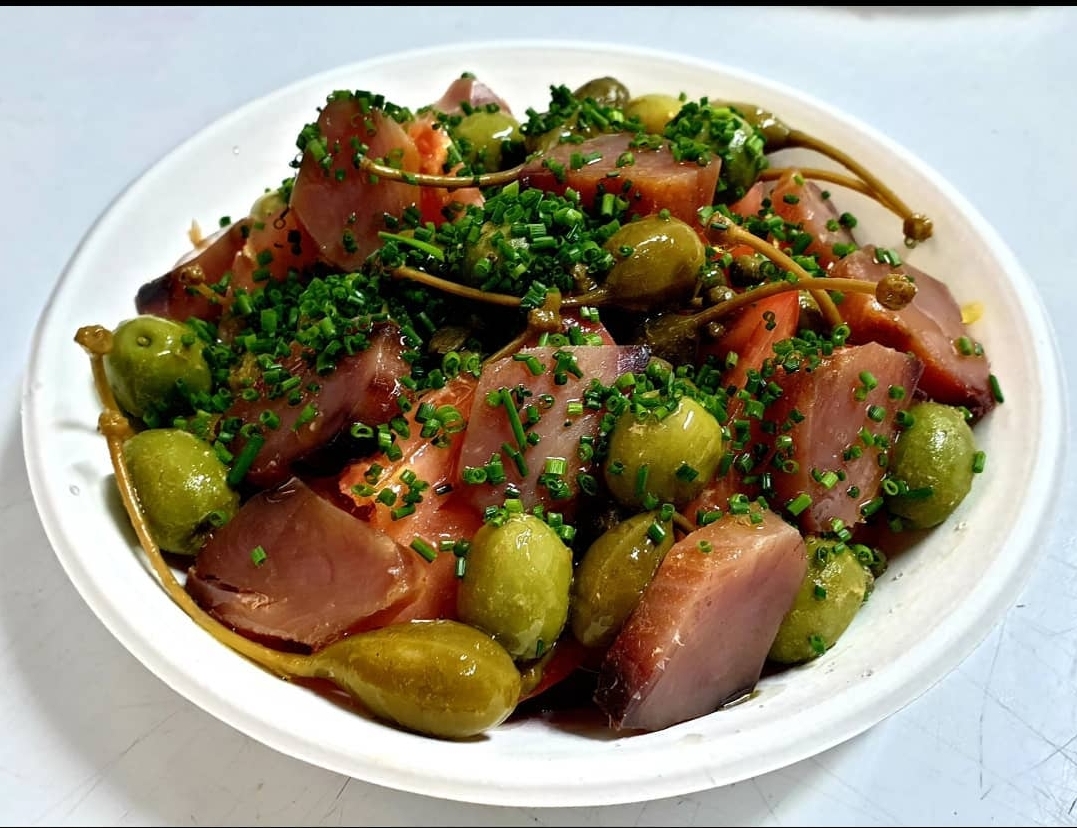 •Jamon de mar, picadillo marinado de pepino, naranja, fruta de la pasión, aji amarillo y sesamo