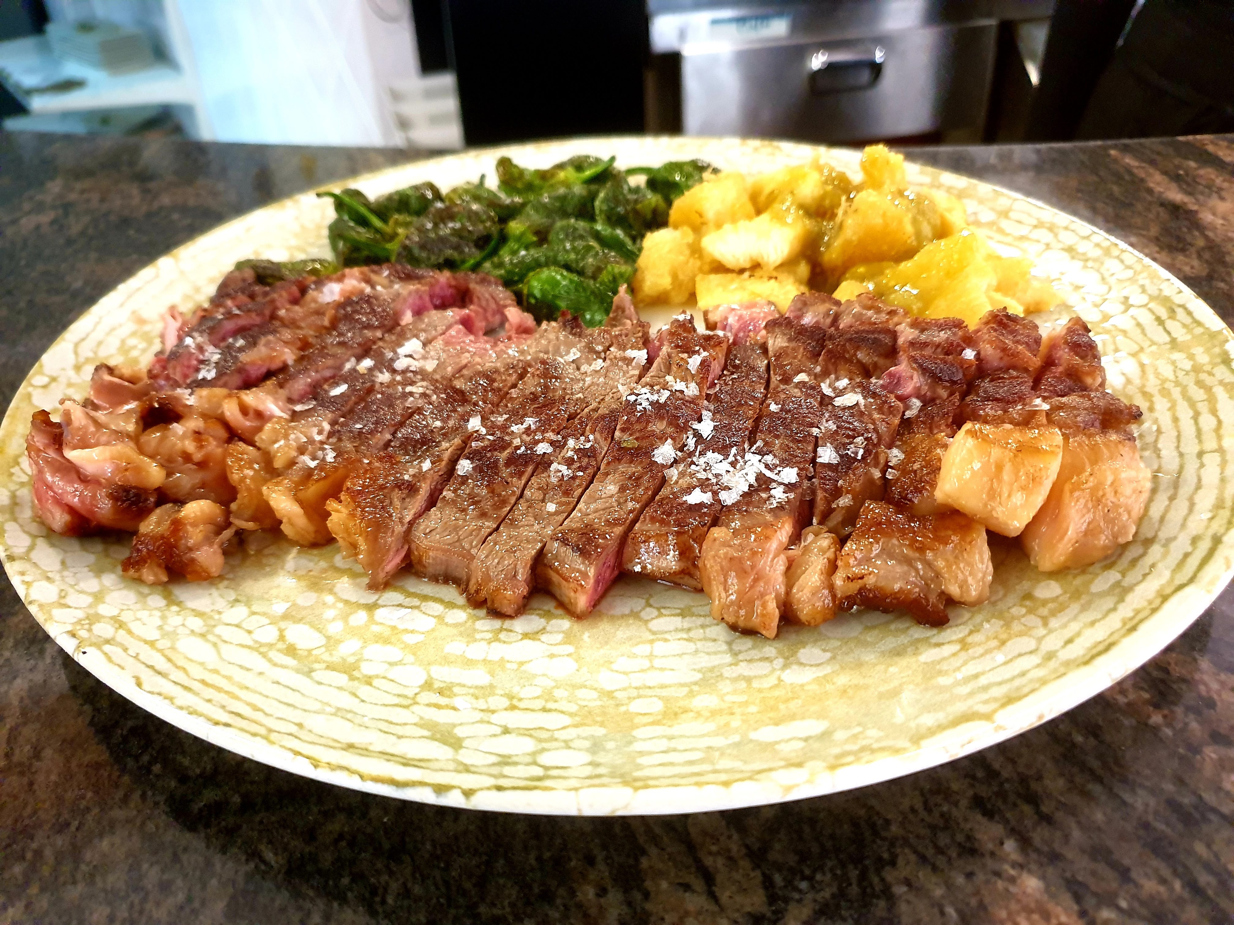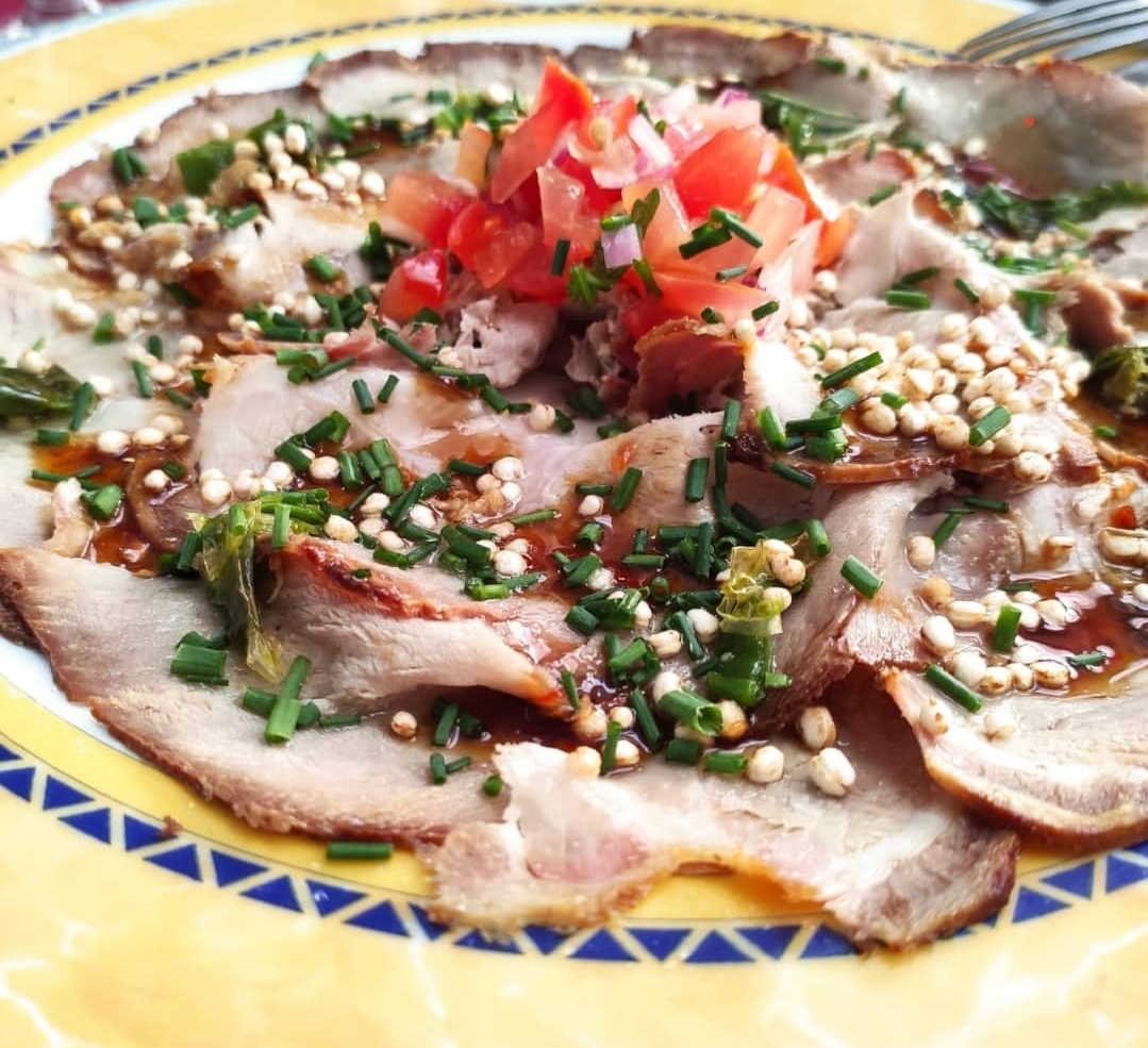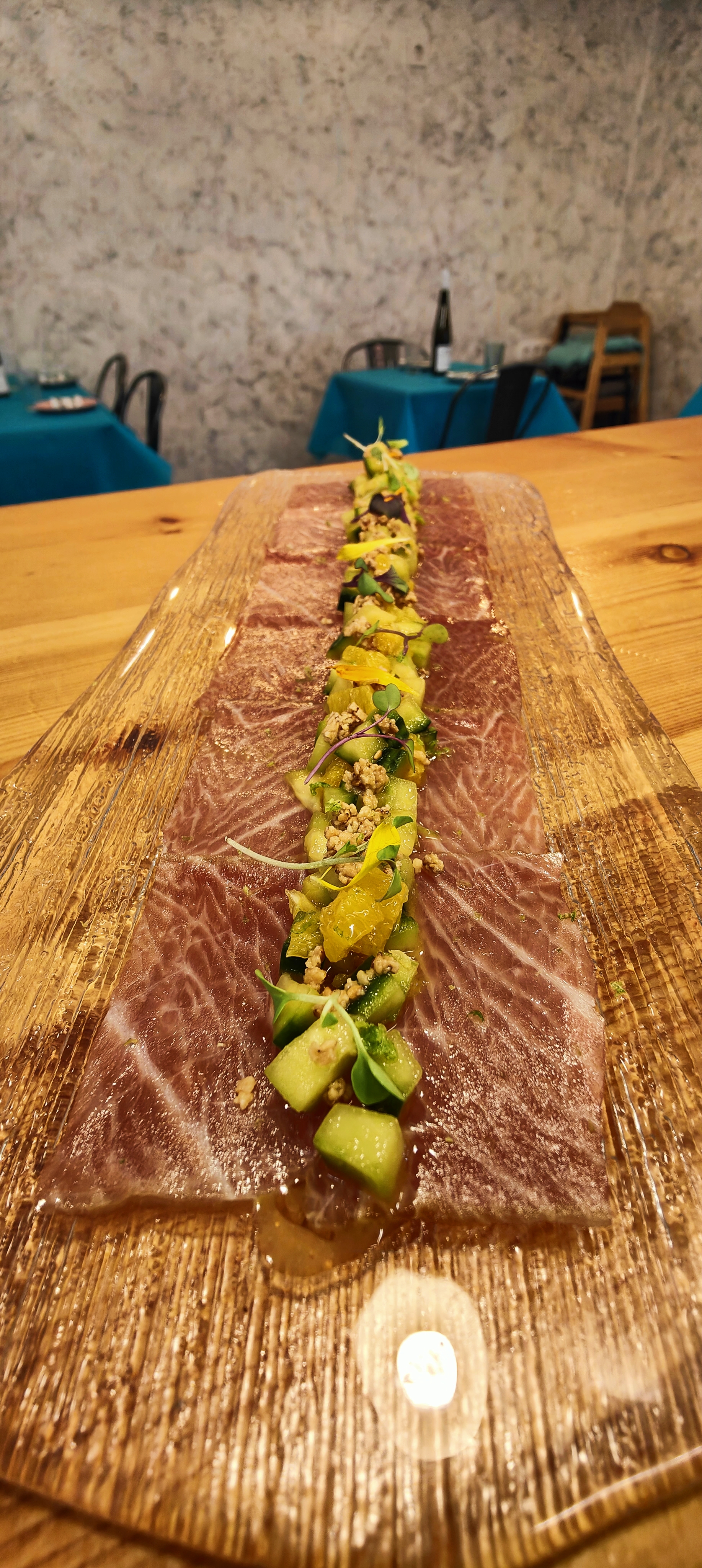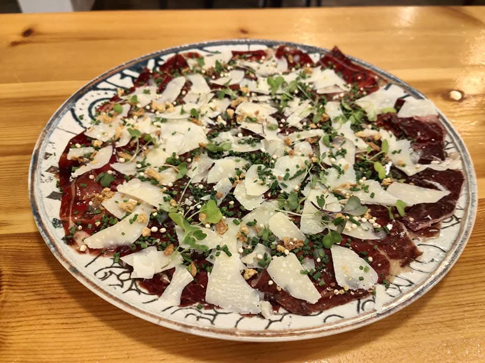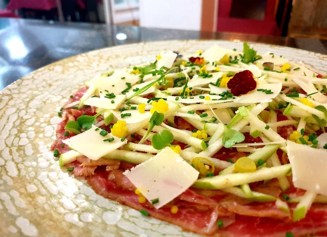 Carpaccio de secreto ibérico, marinado en salsa ponzu, queso parmesano, manzana ácida, guindilla piparra y caviar de yuzu