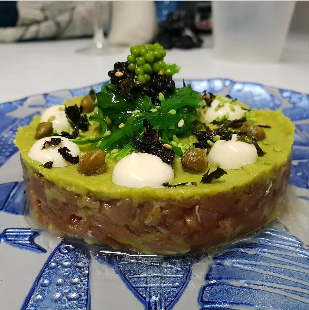 Tartar de atún con alga wacame, sésamo,mayonesa de wasabi, guacamole, ponzu, alcaparras, caviares de wasabi, yuzu, arenque y crujiente de alga