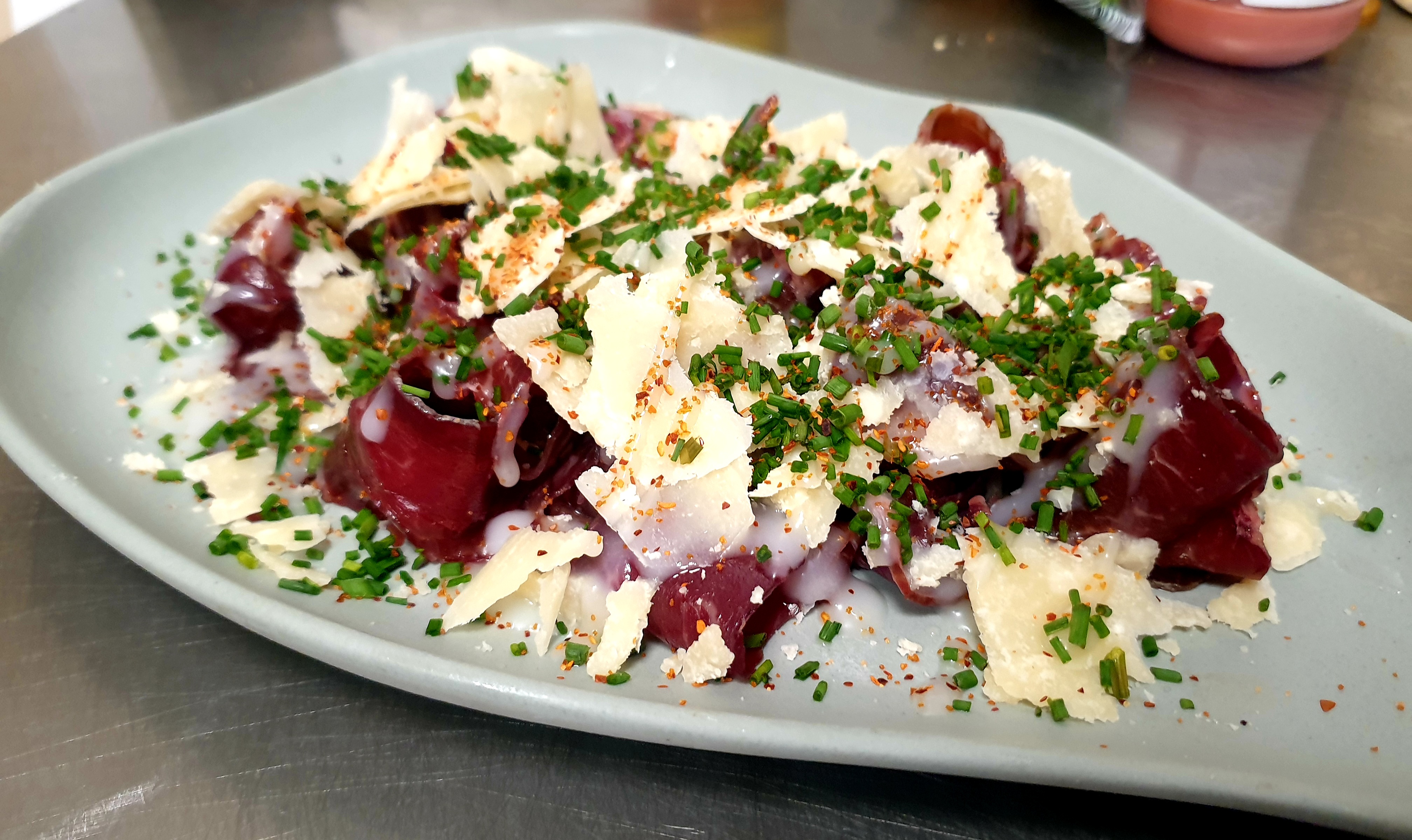 CECINA DE BLACK ANGUS, aceite de lima texturizado, queso parmesano de 30 meses y polvo de chile