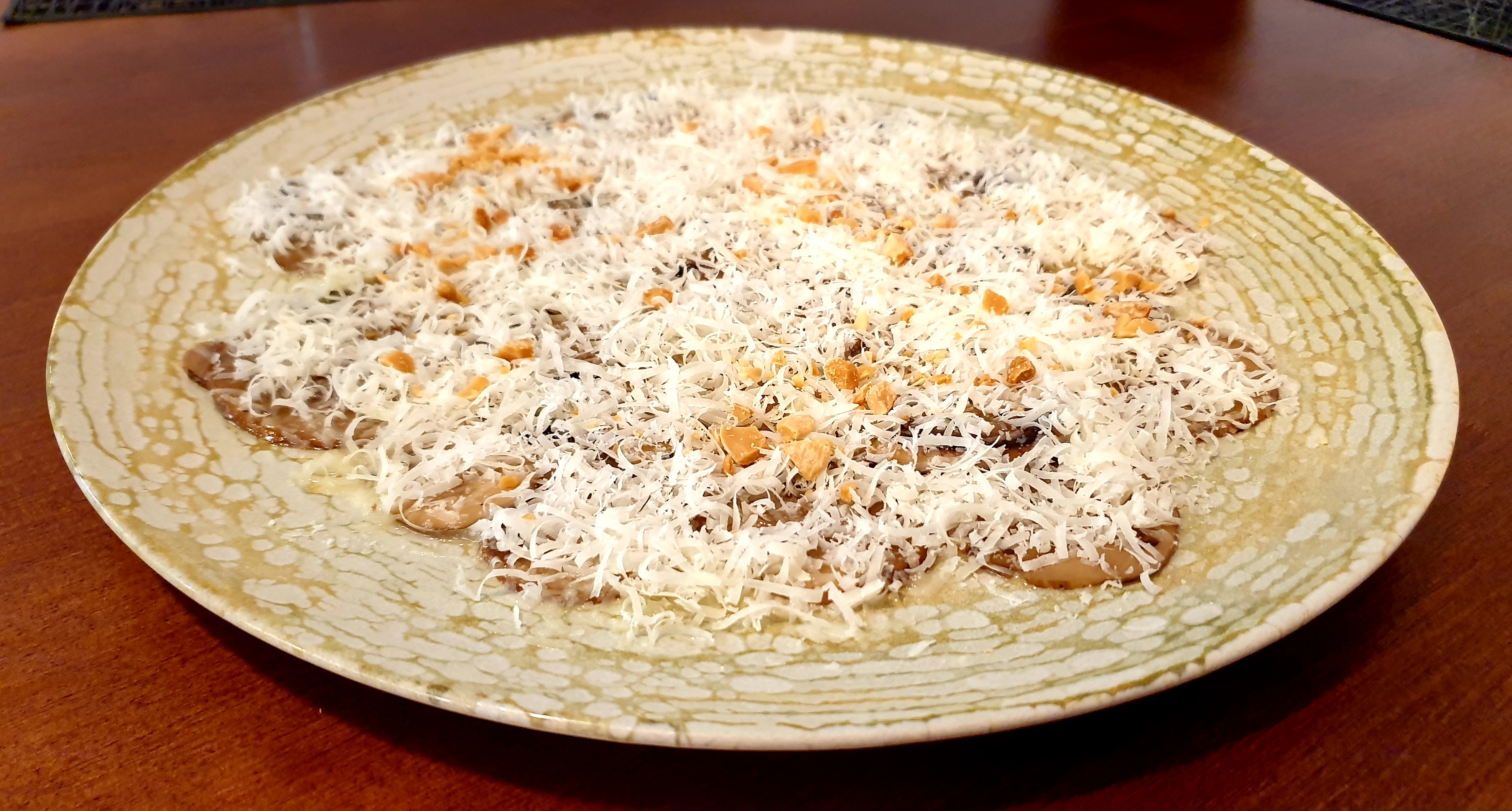 Carpaccio de champiñón portobello marinado en aceite de trufa blanca, queso parmesano y almendra molida
