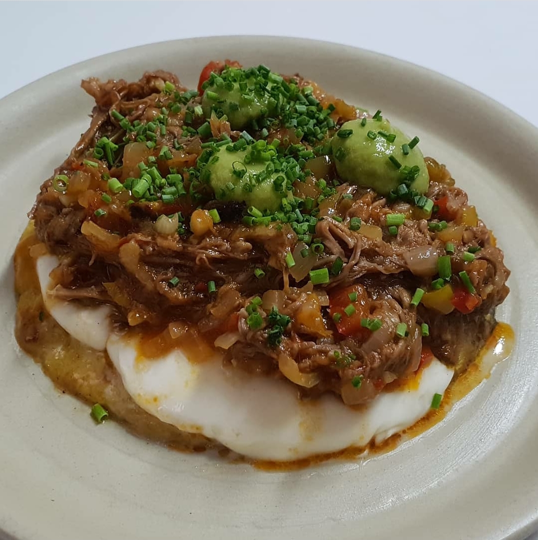 Lascas de chato Murciano con salsa hoisin y Sukiyaki, picadillo mexicano, crujiente de jalapeño, soja texturizada y tostas de maiz mexicanas